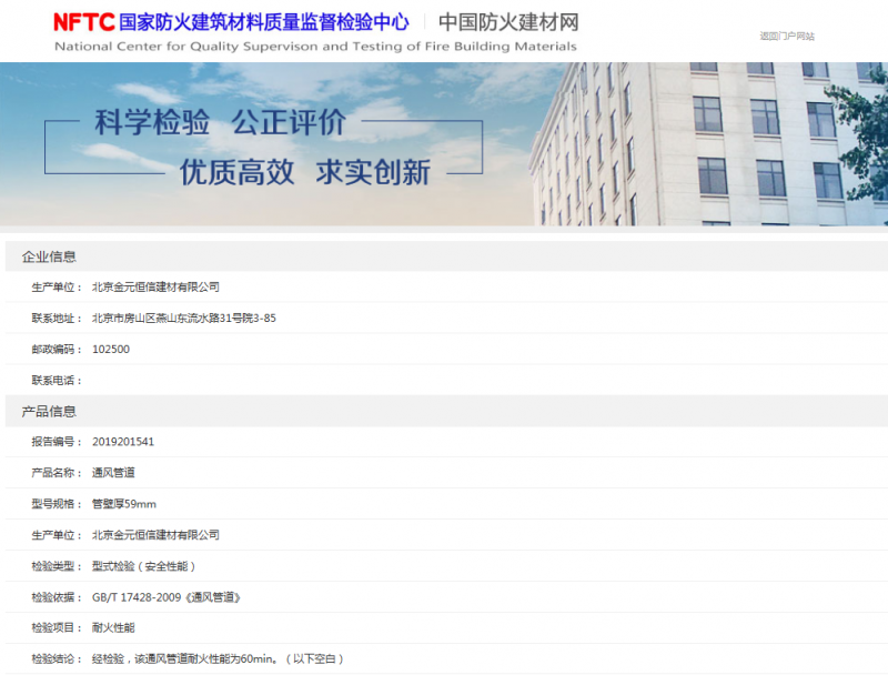 通风管道壁厚59mm可达到防火1小时耐火时限,防火完整性与隔热性能同时满足,有*防火建筑材料质量监督检测中心出具的通风管道1小时耐火时限型式检测报告。